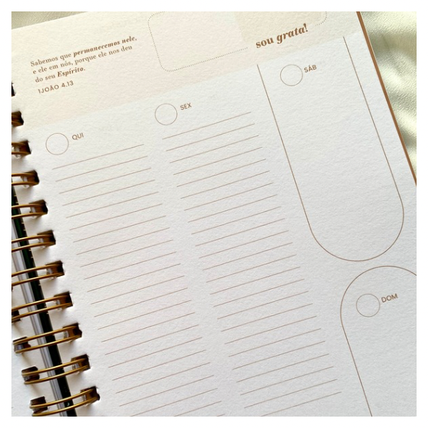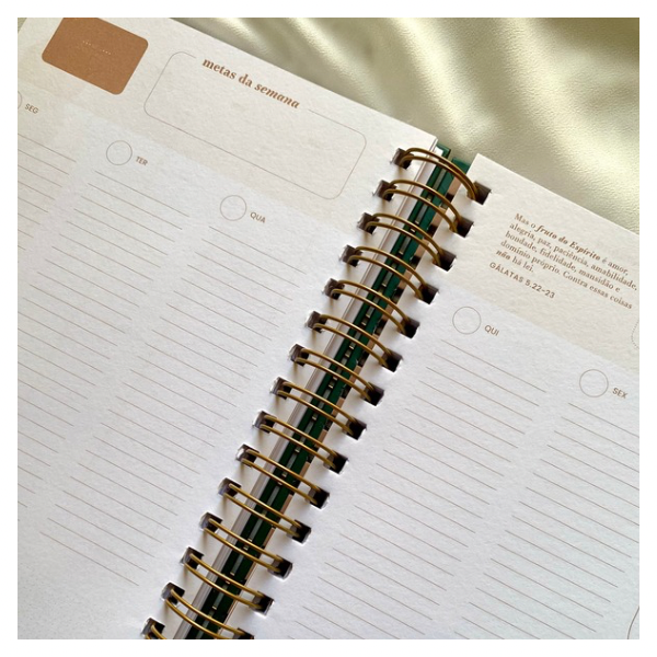 O Planner Estações, criado por Viviane Martinello, se destaca como um produto único por combinar organização do dia a dia com foco no cuidado pessoal, familiar, espiritual e de saúde. Além do tradicional espaço para planejamento de tarefas, ele oferece seções dedicadas ao autocuidado e autoconhecimento, orientações para momentos de qualidade com a família, espaço para registros devocionais, plano de leitura bíblica e muito mais.