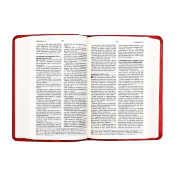 Edição de bolso da Bíblia, na cor Rosa, com tradução de João Ferreira de Almeida, na edição Revista e Corrigida, com ajudas de concordância e referências cruzadas.